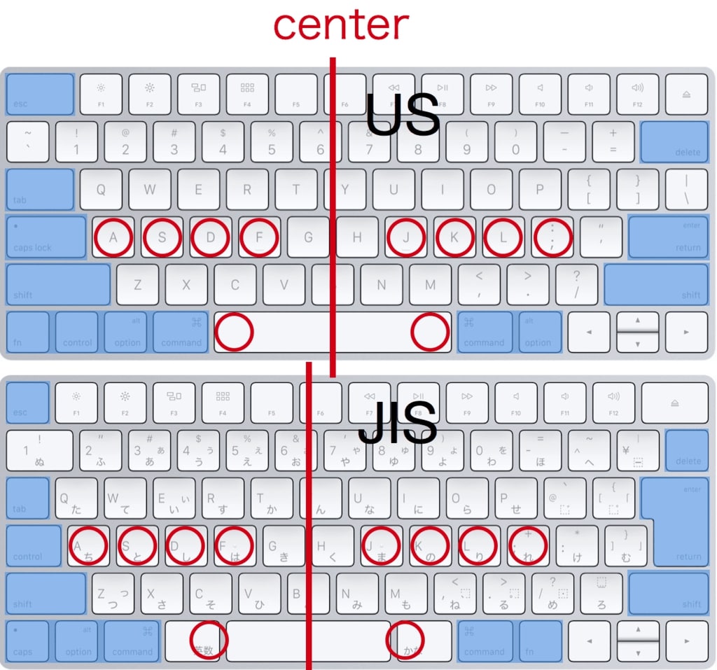- キーボードの中心位置が違う(JIS の方が左寄り)